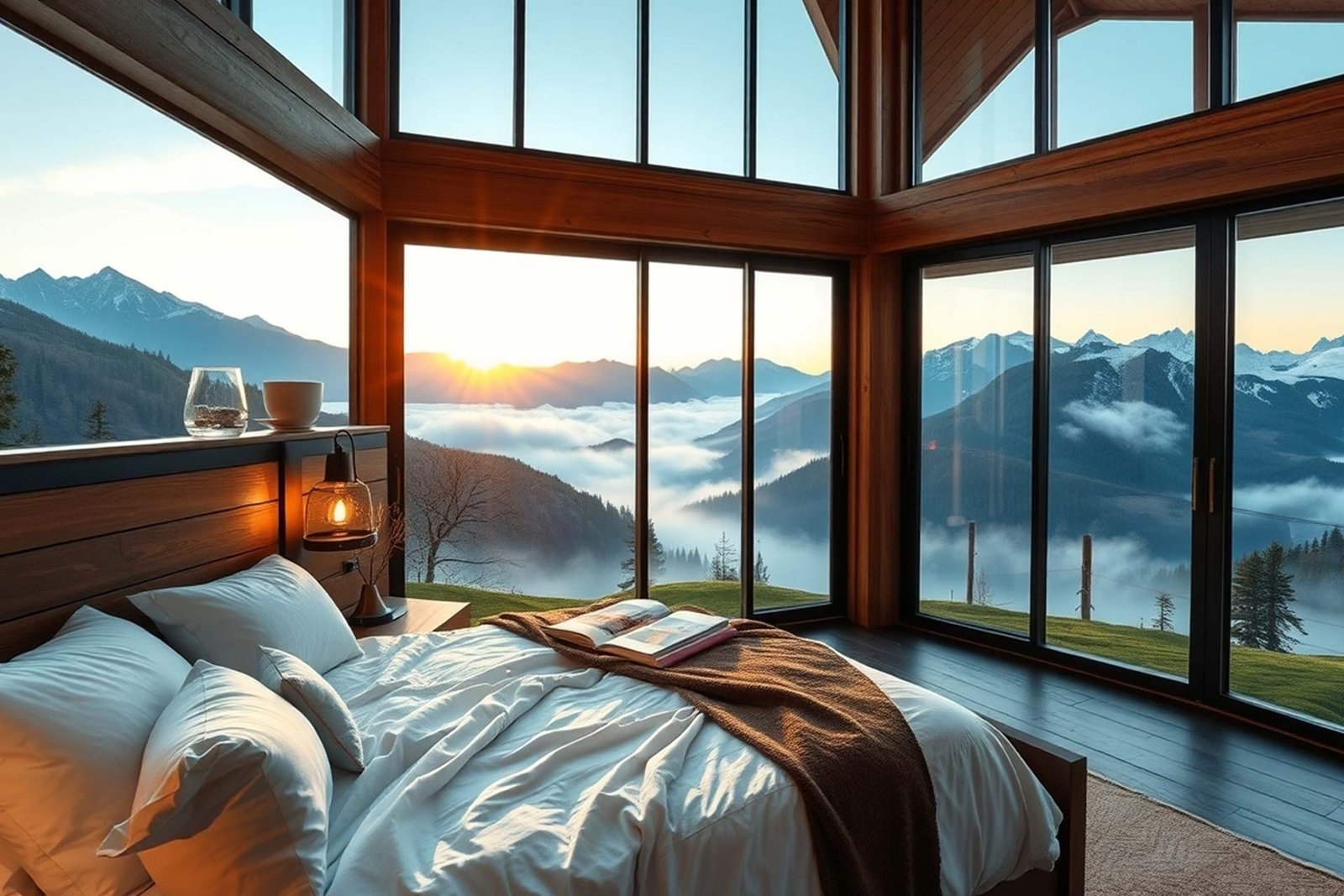 A cozy mountain-inspired room with a private fireplace, perfect for chilly evenings. Rustic charm meets modern comfort with plush linens, natural materials, and a serene atmosphere.